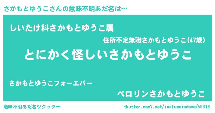 | ポケモン風あだ名 | 『サカゴンZ』『ヒサカモトユウコ』 |