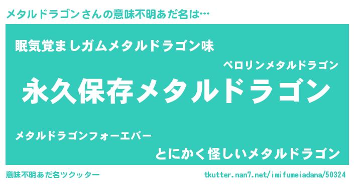 | 女子向けラノベタイトル風あだ名 | 『異世界で失敗しない100のメタルドラゴン』 |