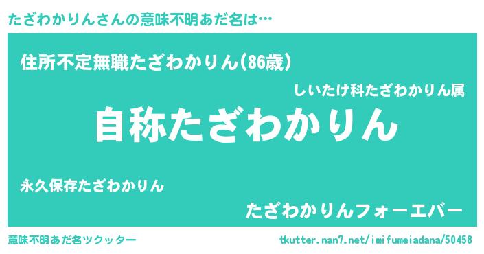 | 男性向けラノベタイトル風あだ名 | 『Re:たざわかりんから始める異世界生活』 |