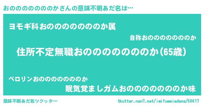 | 女子向けラノベタイトル風あだ名 | 『おのののののののかが死なない童話 林檎のおのののののののかの診療簿』 |
