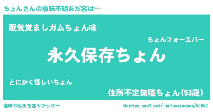 | 男性向けラノベタイトル風あだ名 | 『ちょんという概念が存在しない退屈な世界 』 |