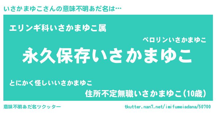 | 男性向けラノベタイトル風あだ名 | 『いさかまゆこという概念が存在しない退屈な世界 』 |