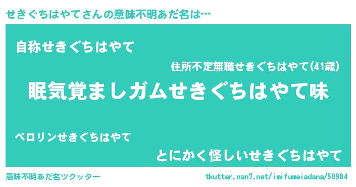 | 女子向けラノベタイトル風あだ名 | 『せきぐちはやて恋絵巻』 |