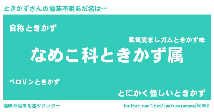 | 男性向けラノベタイトル風あだ名 | 『転生したらときかずだった件』 |