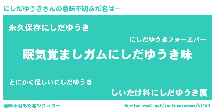 | ヘコむあだ名 | 『にしだゆうき(笑)』『酢こんぶ』 |