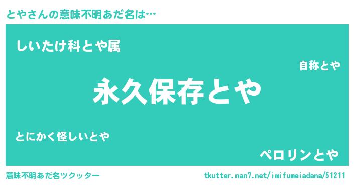 | 男性向けラノベタイトル風あだ名 | 『とやという概念が存在しない退屈な世界 』 |
