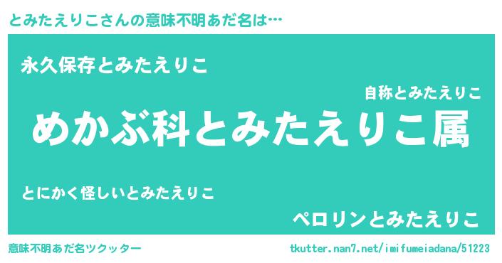 | 胡散臭い通販商品みたいなあだ名 | 『絶対に幸福をもたらす水素水…その名も「とみたえりこ」』 |