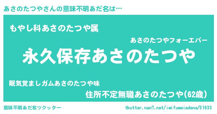 | 男性向けラノベタイトル風あだ名 | 『あさのたつやという概念が存在しない退屈な世界 』 |
