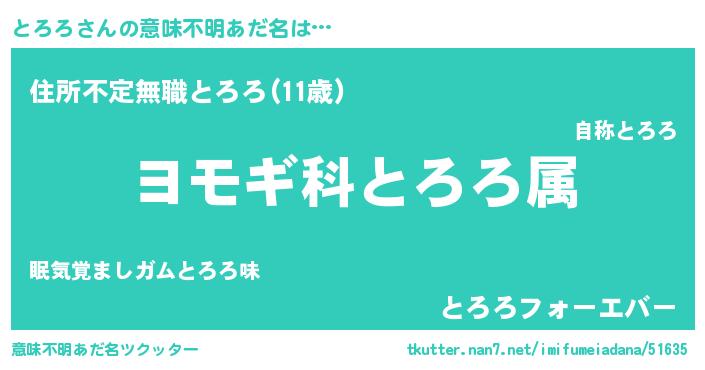 | 男性向けラノベタイトル風あだ名 | 『とろろ~年齢イコール彼女いない歴の魔法使い~』 |