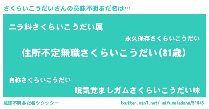 | 男性向けラノベタイトル風あだ名 | 『この素晴らしい世界にさくらいこうだいを!』 |