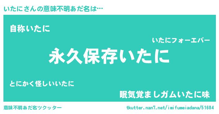 | 男性向けラノベタイトル風あだ名 | 『いたにに滅ぼされるだけの簡単なお仕事です』 |