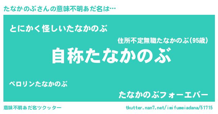 | 男性向けラノベタイトル風あだ名 | 『Re:たなかのぶから始める異世界生活』 |