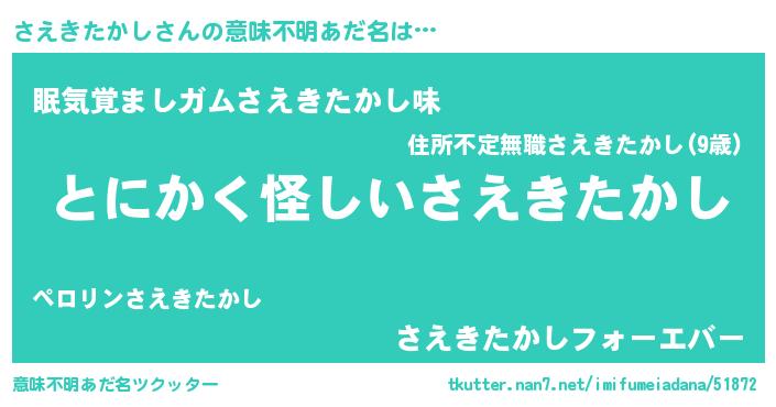 | 男性向けラノベタイトル風あだ名 | 『さえきたかしに滅ぼされるだけの簡単なお仕事です』 |