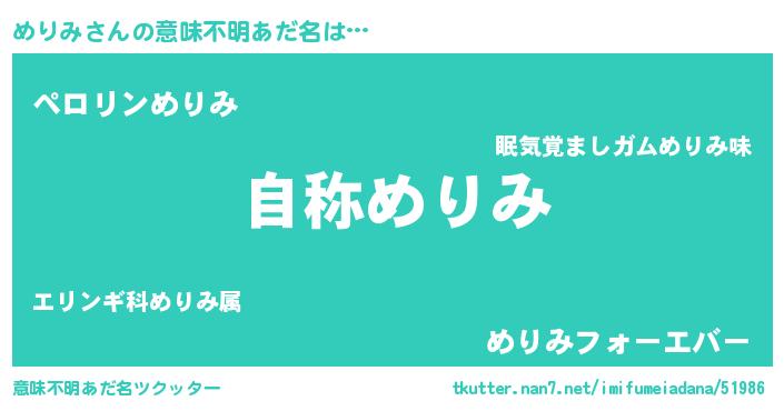 | 男性向けラノベタイトル風あだ名 | 『Re:めりみから始める異世界生活』 |