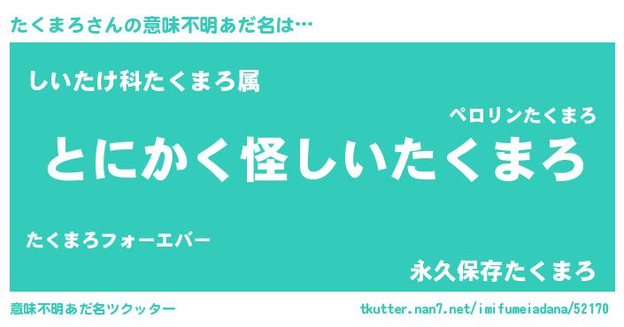 | 男性向けラノベタイトル風あだ名 | 『たくまろの嫁は女の子じゃないと思った?』 |