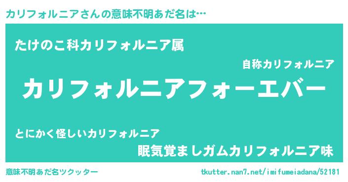 | 女子向けラノベタイトル風あだ名 | 『カリフォルニアの雑貨屋さん』 |