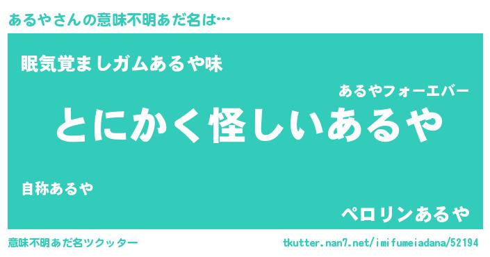 | 女子向けラノベタイトル風あだ名 | 『あるや様がみてる』『死神あるやの再婚』 |