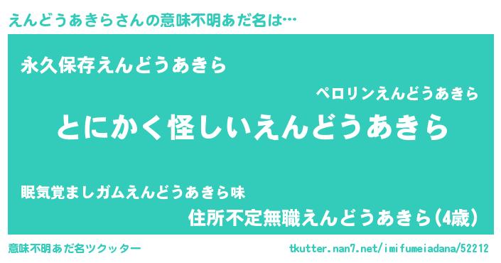 | 可愛いあだ名 | 『えっんぃー』『えんどうあきらママ』 |