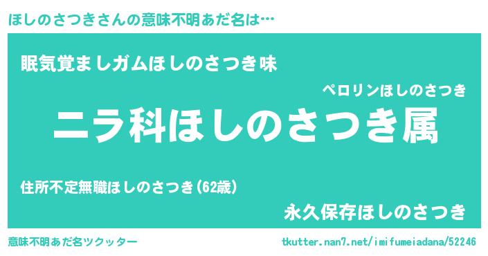 | 男性向けラノベタイトル風あだ名 | 『ほしのさつき~年齢イコール彼女いない歴の魔法使い~』 |