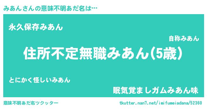 | 男性向けラノベタイトル風あだ名 | 『この素晴らしい世界にみあんを!』 |