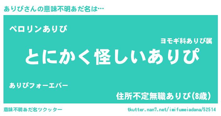 | 男性向けラノベタイトル風あだ名 | 『ありぴの嫁は女の子じゃないと思った?』 |