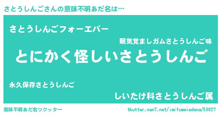 | 男性向けラノベタイトル風あだ名 | 『うちのさとうしんごが世界を掌握している!』 |