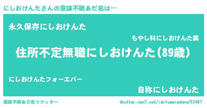| 男性向けラノベタイトル風あだ名 | 『にしおけんたに滅ぼされるだけの簡単なお仕事です』 |
