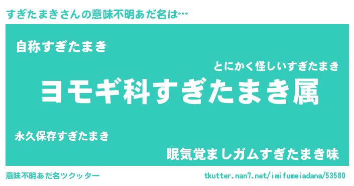 | 男性向けラノベタイトル風あだ名 | 『うちのすぎたまきが世界を掌握している!』 |