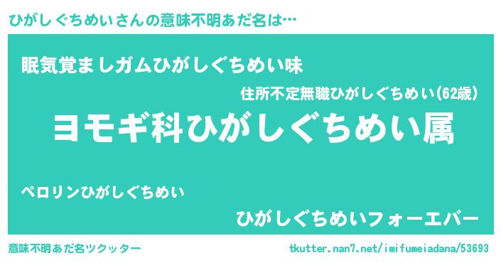 | 男性向けラノベタイトル風あだ名 | 『ひがしぐちめい~年齢イコール彼女いない歴の魔法使い~』 |