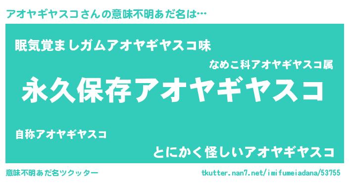 | ヘコむあだ名 | 『アオヤギヤスコ(震え声)』『アオぷりん』 |