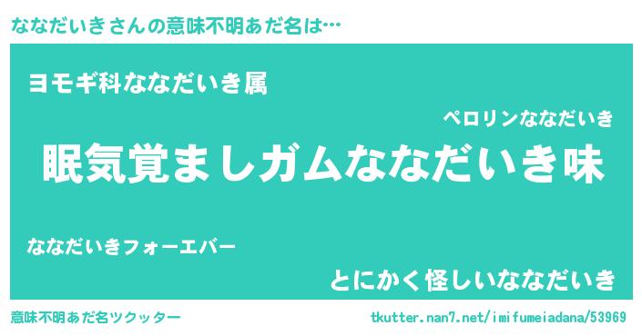| 男性向けラノベタイトル風あだ名 | 『ノーゲーム・ノーナナダイキ』 |