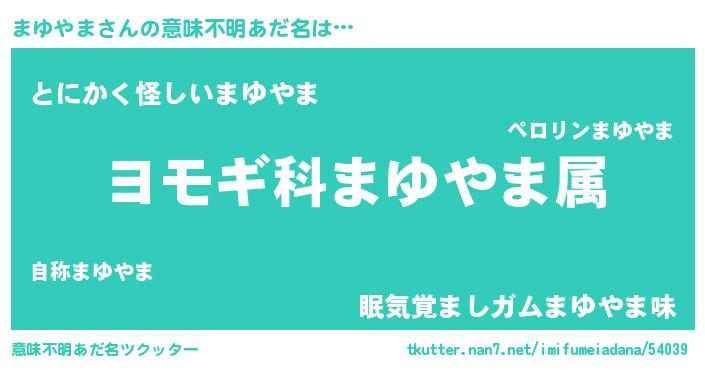 | 男性向けラノベタイトル風あだ名 | 『まゆやま~年齢イコール彼女いない歴の魔法使い~』 |