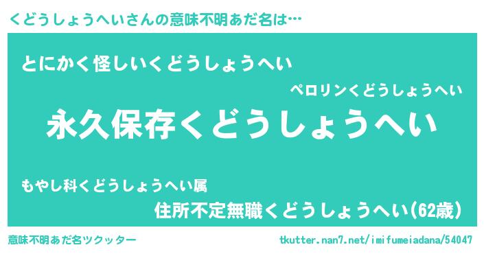 | 胡散臭い通販商品みたいなあだ名 | 『絶対に幸福をもたらす健康食品…その名も「くどうしょうへい」』 |