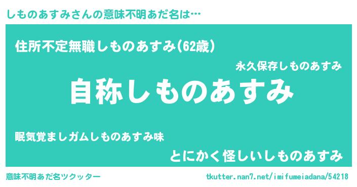 | 男性向けラノベタイトル風あだ名 | 『Re:しものあすみから始める異世界生活』 |