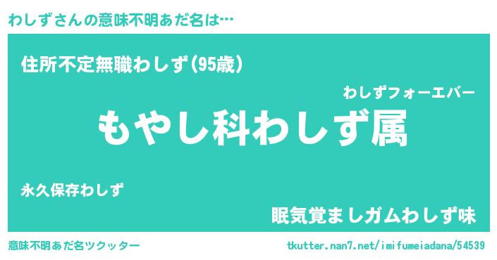 | 男性向けラノベタイトル風あだ名 | 『転生したらわしずだった件』 |