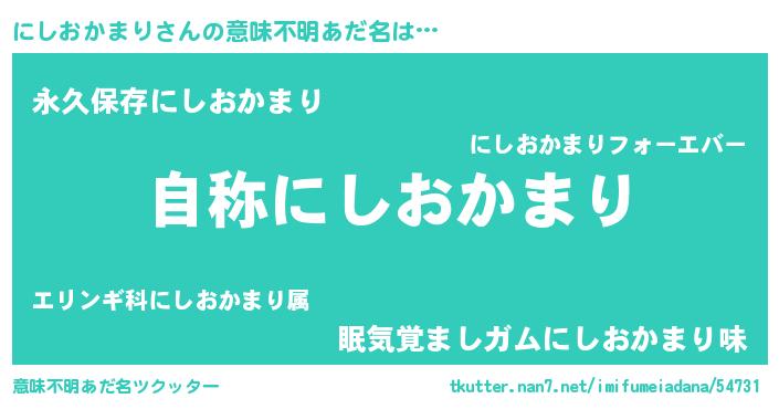| 男性向けラノベタイトル風あだ名 | 『Re:にしおかまりから始める異世界生活』 |