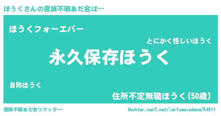 | 男性向けラノベタイトル風あだ名 | 『ほうくという概念が存在しない退屈な世界 』 |