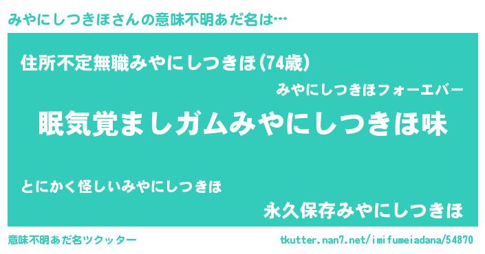 | ヘコむあだ名 | 『みやにしつきほ(遠い目)』『なまこ酢』 |