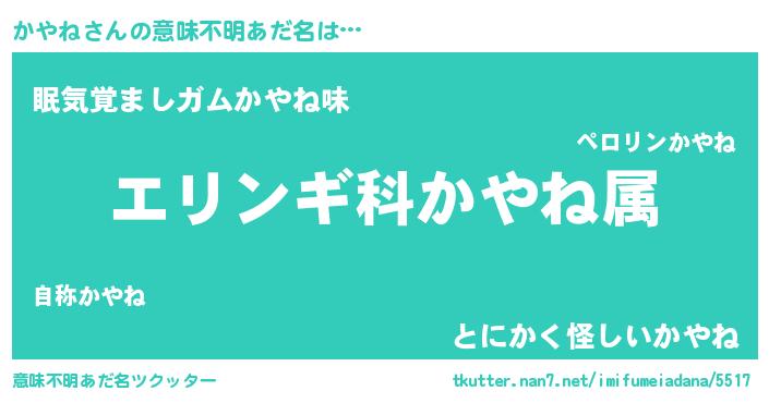 | 男性向けラノベタイトル風あだ名 | 『カヤネスレイヤー』『かやねの憂鬱』 |