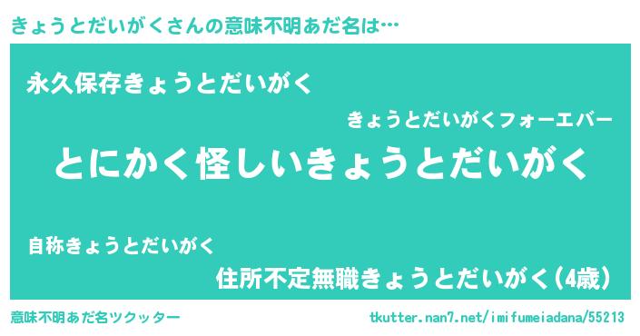 | ヘコむあだ名 | 『きょお』『きょうとだいがく(小並感)』 |
