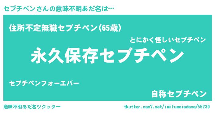 | 男性向けラノベタイトル風あだ名 | 『セブチペンという概念が存在しない退屈な世界 』 |