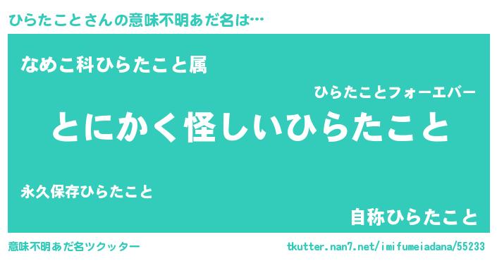 | 男性向けラノベタイトル風あだ名 | 『ひらたことの嫁は女の子じゃないと思った?』 |