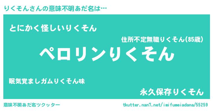 | 男性向けラノベタイトル風あだ名 | 『りくそんの憂鬱』『魔弾の王とりくそん』 |