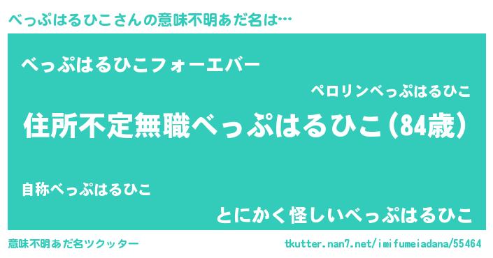 | 男性向けラノベタイトル風あだ名 | 『魔弾の王とべっぷはるひこ』 |