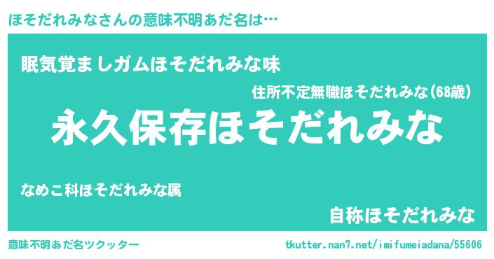 | 胡散臭い通販商品みたいなあだ名 | 『来世でも幸せになれる水素水…その名も「ほそだれみな」』 |
