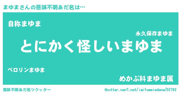 | 男性向けラノベタイトル風あだ名 | 『ダンジョンにまゆまを求めるのは間違っているだろうか』 |