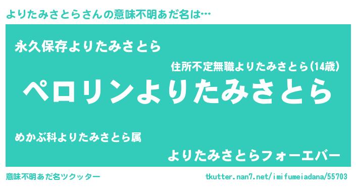 | 胡散臭い通販商品みたいなあだ名 | 『億万長者になれるブレスレット…その名も「よりたみさとら」』 |