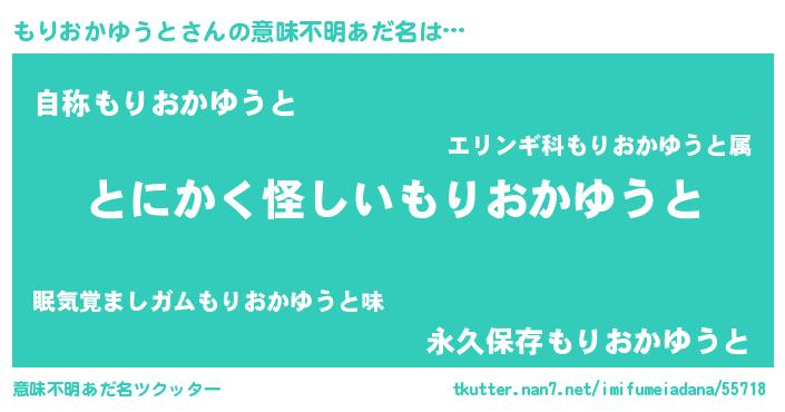 | 男性向けラノベタイトル風あだ名 | 『もりおかゆうとの嫁は女の子じゃないと思った?』 |