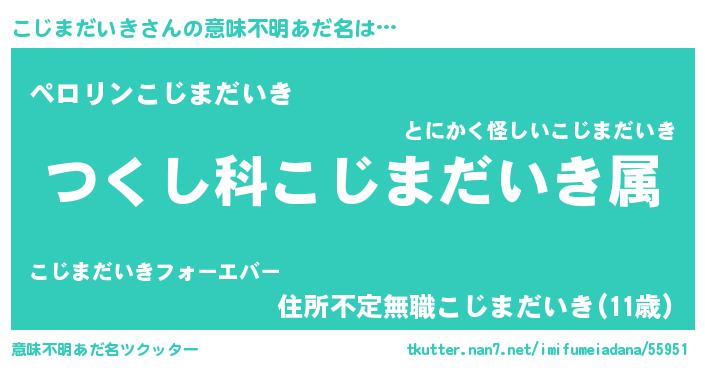 | 男性向けラノベタイトル風あだ名 | 『こじまだいき~年齢イコール彼女いない歴の魔法使い~』 |