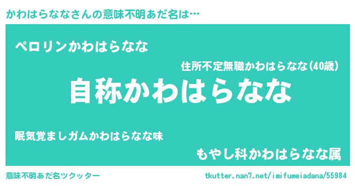 | 胡散臭い通販商品みたいなあだ名 | 『ガンによく効く高麗人参…その名も「かわはらなな」』 |